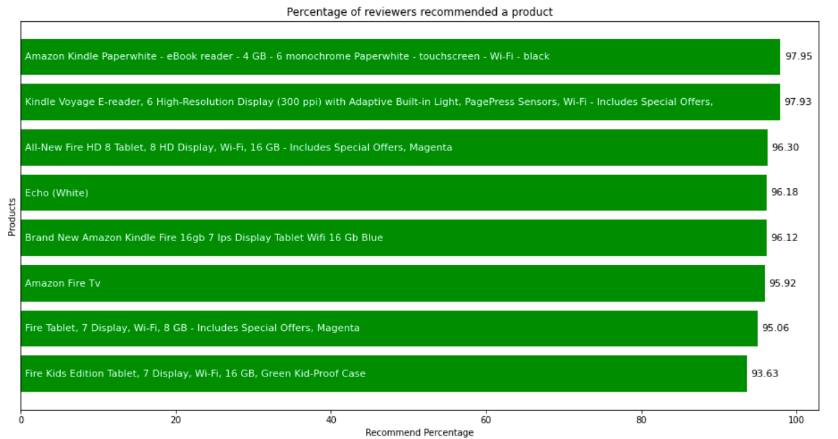 recommend_percentage=pd.DataFrame(((df.groupby('name')['reviews.doRecommend'].sum()*100)/df.groupby('name')['reviews.doRecommend'].count()).sort_values(ascending=True))plt.figure(figsize=(16,8))plt.xlabel('Recommend Percentage')plt.ylabel('Products')plt.title('Percentage of reviewers recommended a product')recommend_graph=plt.barh(np.arange(len(recommend_percentage.index)),recommend_percentage['reviews.doRecommend'],color='green')# Writing product names on barfor bar,product in zip(recommend_graph,recommend_percentage.index):plt.text(0.5,bar.get_y()+0.4,'{}'.format(product),va='center',fontsize=11,color='white')# Writing recommendation percentage on graphfor bar,percentage in zip(recommend_graph,recommend_percentage['reviews.doRecommend']):plt.text(bar.get_width()+0.5,bar.get_y()+0.4,'%.2f'%percentage,va='center',fontsize=11,color='black')plt.yticks([])plt.show()