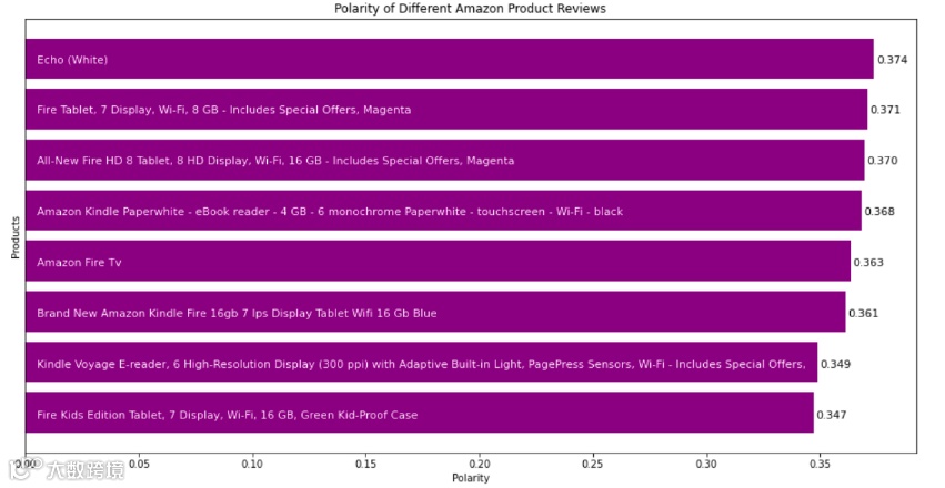 product_polarity_sorted=pd.DataFrame(df.groupby('name')['polarity'].mean().sort_values(ascending=True))plt.figure(figsize=(16,8))plt.xlabel('Polarity')plt.ylabel('Products')plt.title('Polarity of Different Amazon Product Reviews')polarity_graph=plt.barh(np.arange(len(product_polarity_sorted.index)),product_polarity_sorted['polarity'],color='purple',)# Writing product names on barfor bar,product in zip(polarity_graph,product_polarity_sorted.index):plt.text(0.005,bar.get_y()+bar.get_width(),'{}'.format(product),va='center',fontsize=11,color='white')# Writing polarity values on graphfor bar,polarity in zip(polarity_graph,product_polarity_sorted['polarity']):plt.text(bar.get_width()+0.001,bar.get_y()+bar.get_width(),'%.3f'%polarity,va='center',fontsize=11,color='black')plt.yticks([])plt.show()