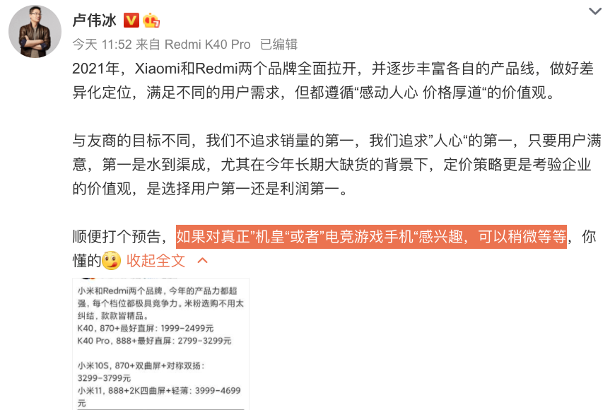 另一边,今天Redmi卢伟冰在微博预热了一款「真正“机皇”或“电竞游戏手机”」,预告的应该是之前那款将首发联发科天玑1200处理器的Redmi首款游戏手机,就是不知道和小米11大杯系列哪个先来~