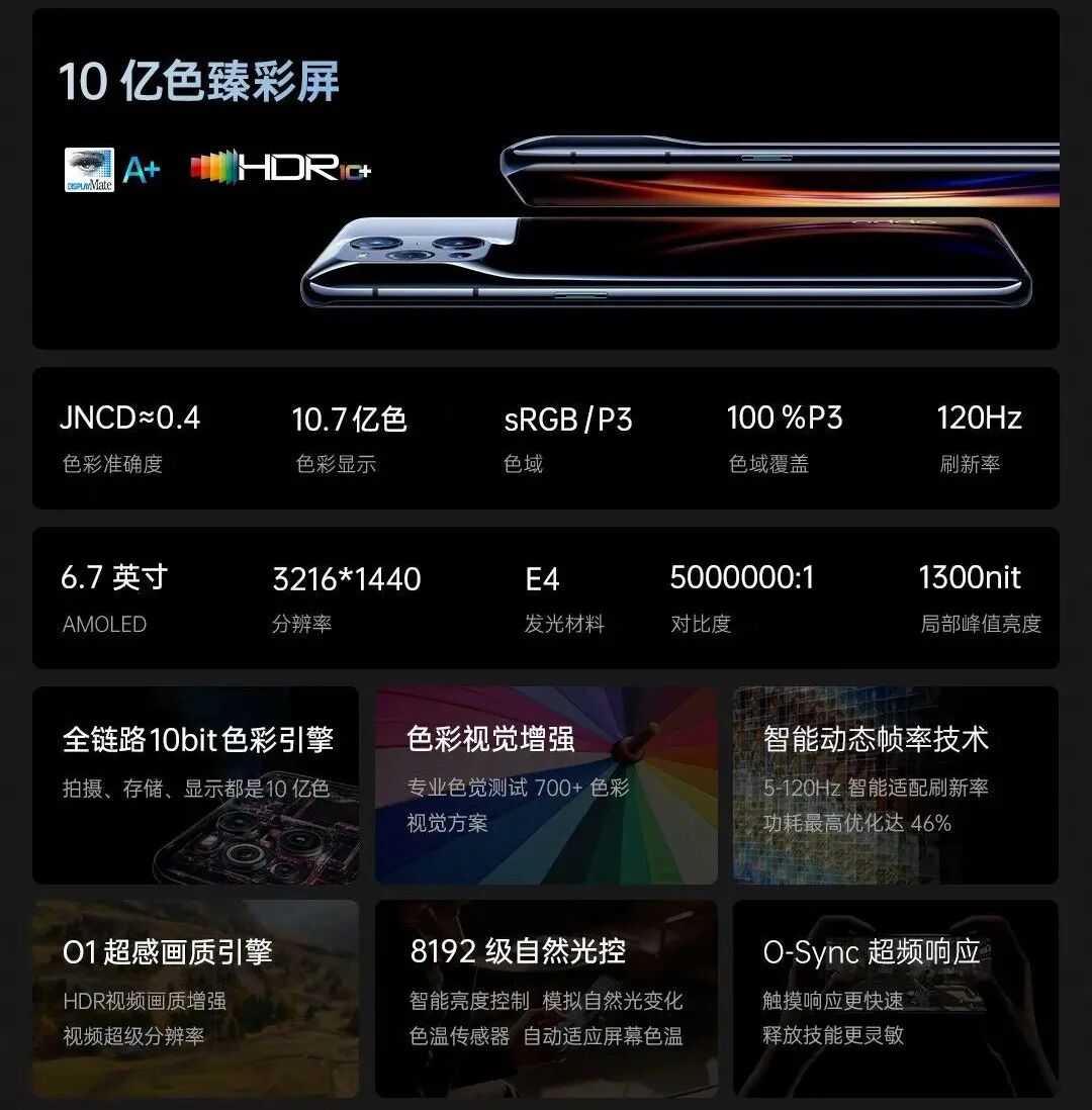 屏幕+外观,OPPO Find X3/Pro一致:均采用6.7英寸3216*1440分辨率的AMOLED LTPO左上角单挖孔曲面屏,三星E4材质,120Hz屏幕刷新率,10.7亿色,局部峰值亮度1300nit,全链路10bit色彩引擎,DisplayMateA+认证,525ppi等等。