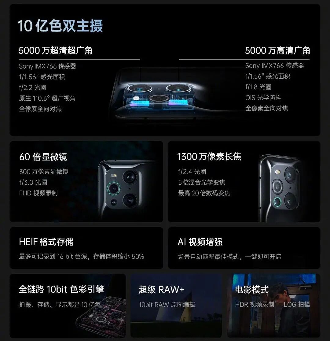 相机规格,OPPO Find X3/Pro一致:前置32MP 5P镜头,后置四摄:①50MP广角主摄 索尼IMX766 6P镜头 有ois➕②50MP超广角 索尼IMX766 有自由曲面镜片 7P镜头➕③13MP长焦 5P镜头 5倍混合光变最高20倍数码变焦+④3MP显微镜镜头 支持60倍微距(可以直接用来拍手机屏幕像素排列),提供姜文电影滤镜一号和姜文电影滤镜二号。