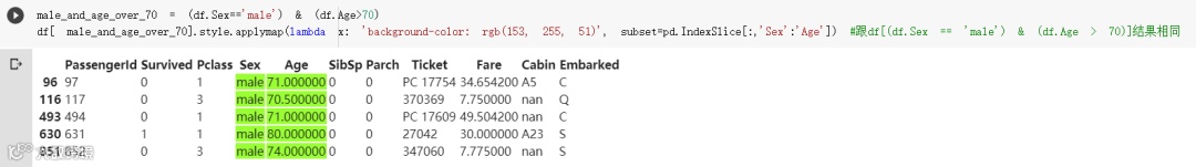 male_and_age_over_70是我们定义的一个masking,可以把同时符合两个布尔判断式(大于70 岁、男性)的样本选取出来。上面注解有相同效果,但当存在多个判断式时,有个准确说明making意义的变量(上例的male_and_age_over_70)会让你的程序代码好懂一点。