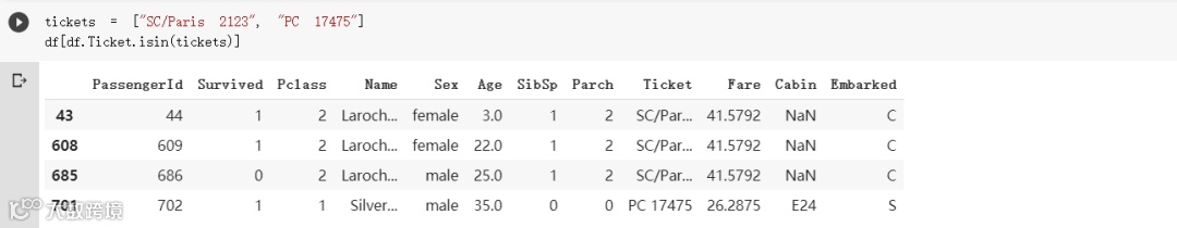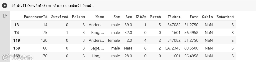 接着利用上小节看过的isin函数就能轻松取得Ticket栏位值为前k大值的样本: