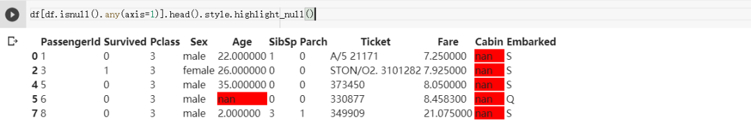 这边刚好所有样本的Cabin栏位皆为空值,但倒数第2个样本就算其Cabin栏不为空值,也会因为Age栏为空而被选出。
