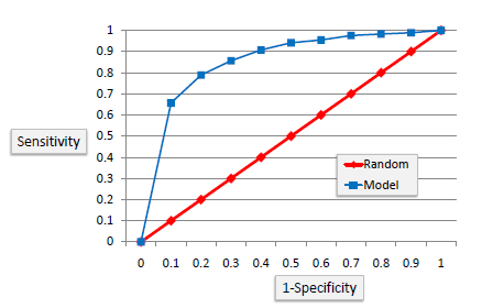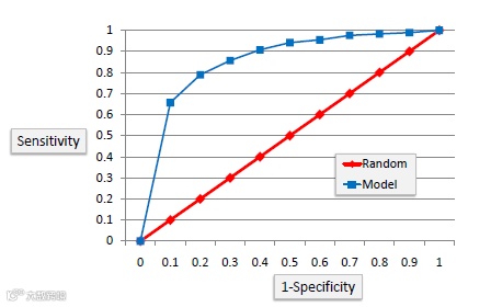 理想情况下,曲线快速爬向左上,表示模型准确预测数据。红色斜对角线表示随机模型。
