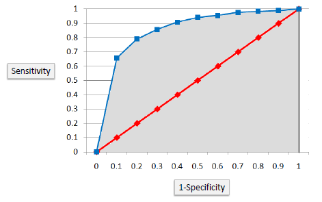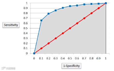在模型评估阶段常被用作最重要的评估指标来衡量模型的准确性,横坐标为其中随机分类的模型AUC为0.5,所以模型的AUC基线值大于0.5才有意义。