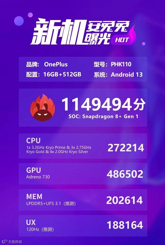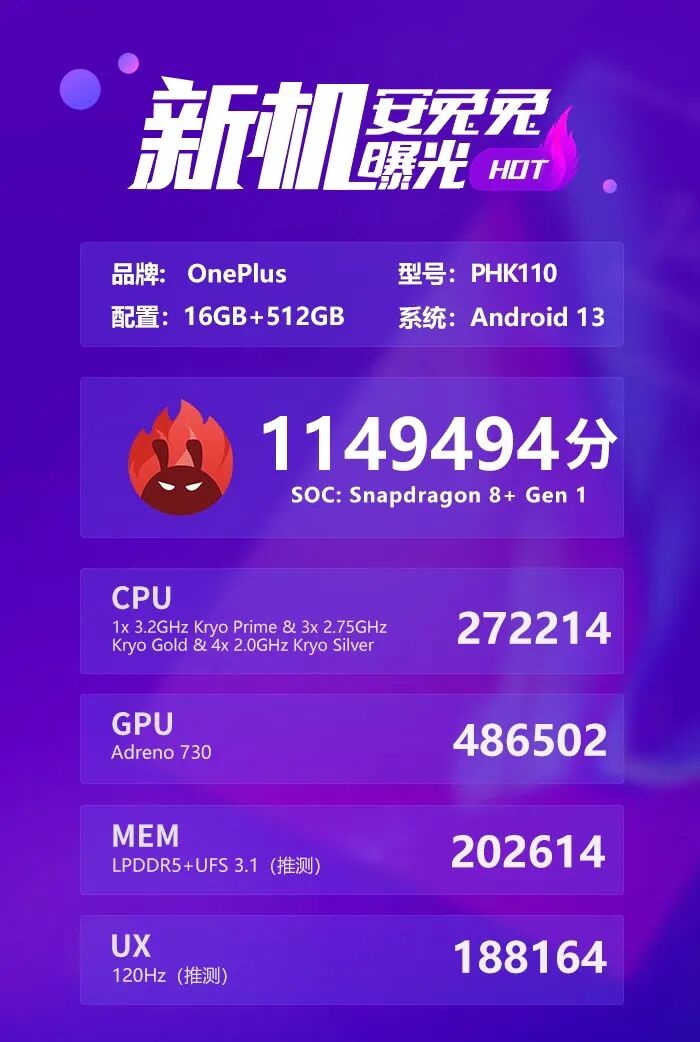 核心配置上,安兔兔披露的跑分显示一加Ace2搭载的是骁龙8+满血版(主频3.2GHz),16+512GB版本,综合跑分1149494分。