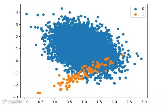 接下来,是数据集的散点图,该图展示了大量多数类(蓝色)的实例和少量少数类(橙色)的实例,其中有少许类的值重叠。
