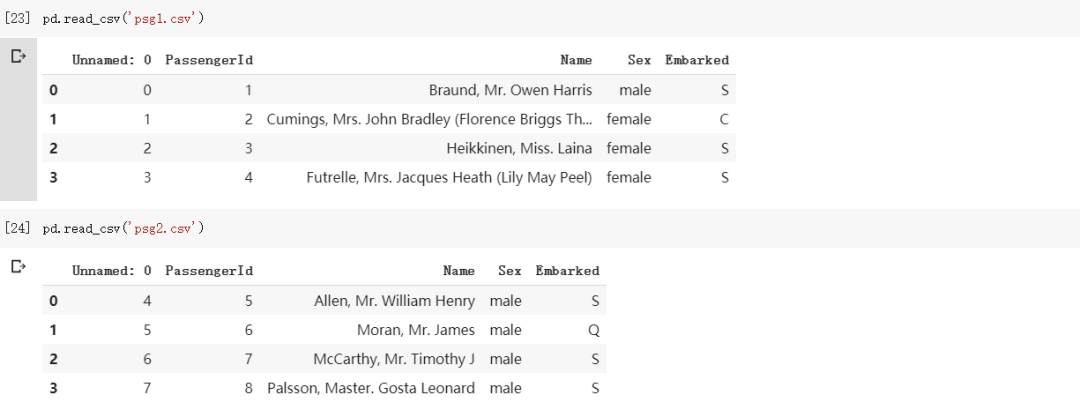 注意上面2个DataFrames的内容虽然分别代表不同乘客,其格式却是一模一样。这种时候你可以使用pd.concat将分散在不同CSV的乘客数据合并成单一DataFrame,方便之后处理: