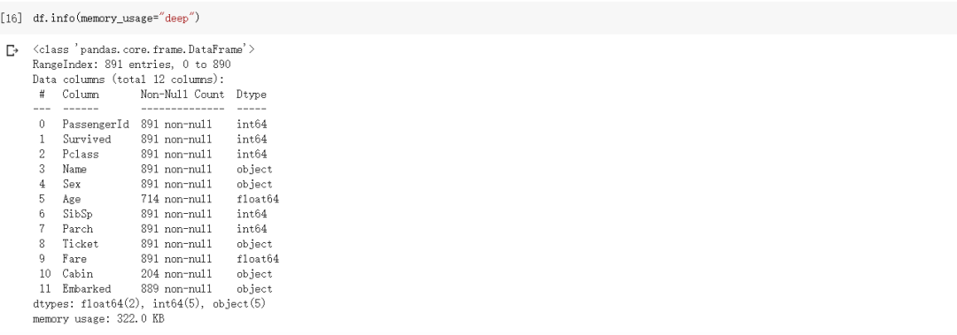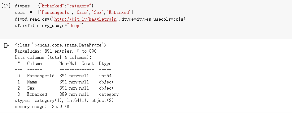 从最后一列可以看出Titanic这个小DataFrame只占了322 KB。这边使用的df不占什么内存,但如果你想读入的DataFrame很大,可以只读入特定的栏位并将已知的分类型(categorical)栏位转成category型态以节省内存(在分类数目较数据量小时有效):