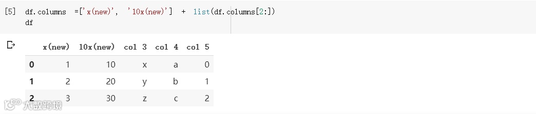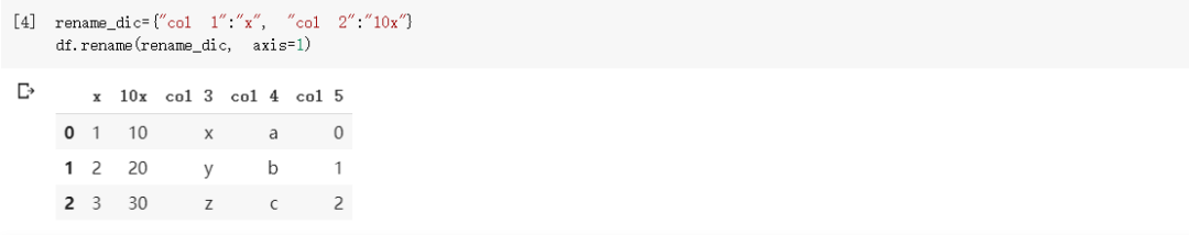 这里也很直观,就是给一个将旧列名对应到新列名的Python dict。值得注意的是参数axis=1:在pandas里大部分函数预设处理的轴为行(row),以axis=0表示;而将axis设置为1则代表你想以列(column)为单位套用该函数。