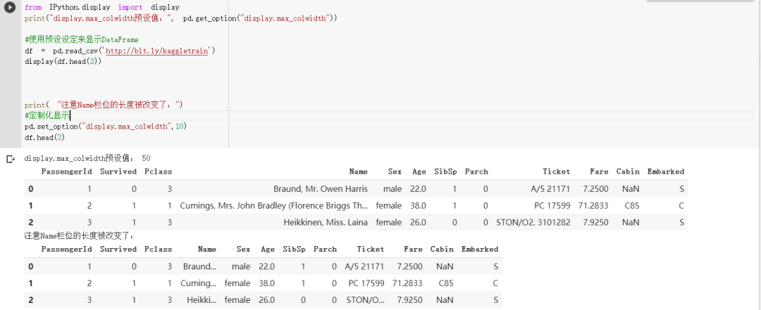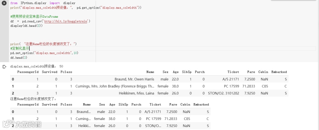 这边你一样可以通过pd.set_option函数来限制Titanic数据集里头Name栏位的显示长度: