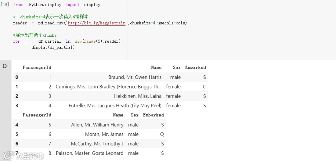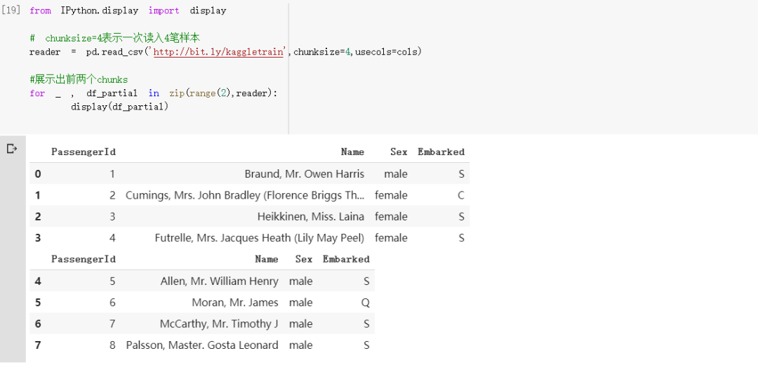 另外如果你想在有限的内存处理巨大CSV文档,也可以透通过chunksize参数来限制一次读入的行数(rows):