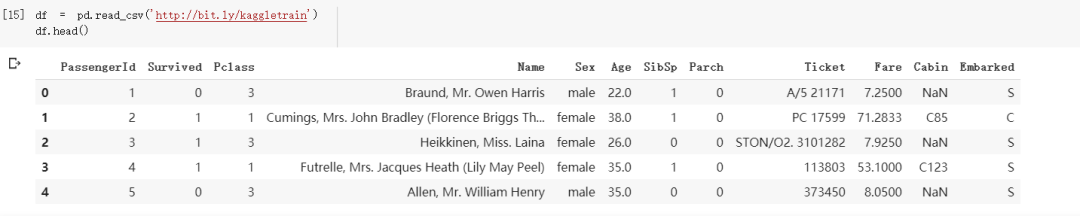 不限于本地档案,只要有正确的URL 以及网络连接就可以将网络上的任意CSV 档案转成DataFrame。比方说你可以将Kaggle著名的Titanic竞赛的CSV档案从网络上下载下来并转成DataFrame: