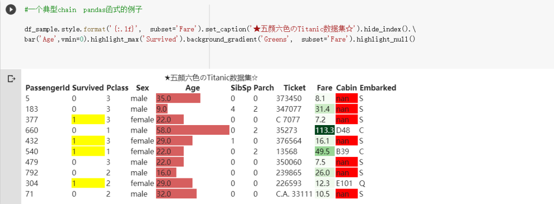 瞧!原来的DataFrame还是挺淳朴的,注意Fare栏位里的小数点并没有因为刚刚的styling而变少,而这让你在呈现DataFrame时有最大的弹性。