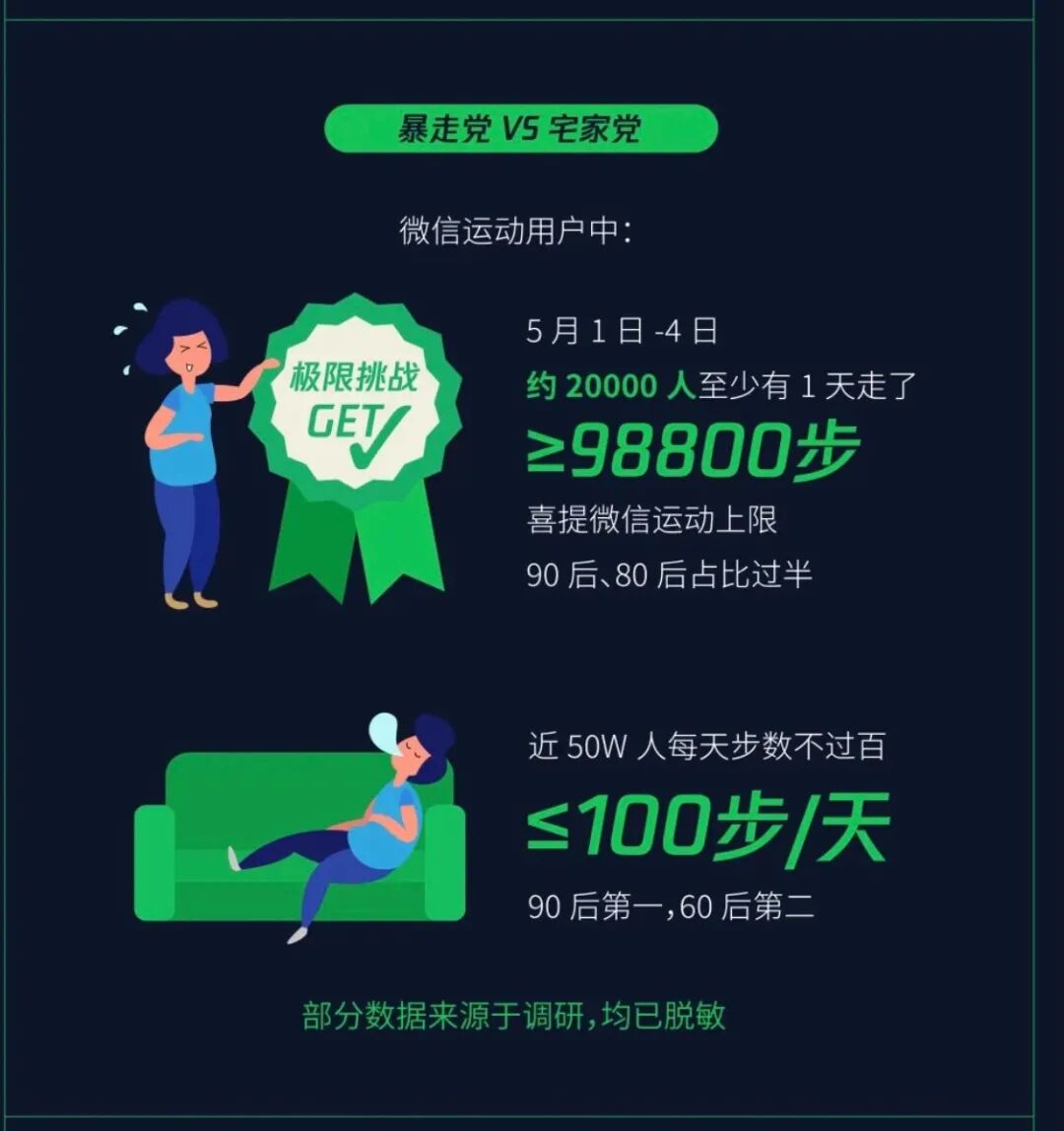 据微信发布的五一数据报告显示,5月1日至 5月4日,全国微信运动用户日均总步数2.72万亿步,相当于往返月球1947次,往返火星13次;约2万名用户微信运动最高步数至少有一天达到98800步。