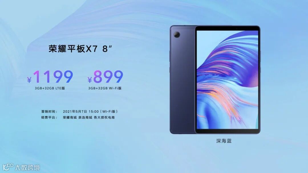 荣耀平板X7售价899元起,主要参数有:8英寸1280*800分辨率IPS屏幕,机身重量为325g,联发科MT8768T芯片,前置2MP,后置5MP,5100mAh电池,5V/2A 10W充电器,Micro-usb充电口,保留3.5mm耳机孔,支持Micro SD最大512GB拓展,内置基于Android 10的MagicUI 4.0等。