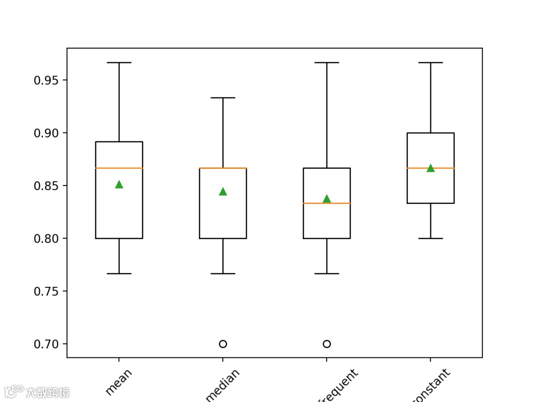 # compare statistical imputation strategies for the horse colic datasetfrom numpy import meanfrom numpy import stdfrom pandas import read_csvfrom sklearn.ensemble import RandomForestClassifierfrom sklearn.impute import SimpleImputerfrom sklearn.model_selection import cross_val_scorefrom sklearn.model_selection import RepeatedStratifiedKFoldfrom sklearn.pipeline import Pipelinefrom matplotlib import pyplot# load dataseturl = 'https://raw.githubusercontent.com/jbrownlee/Datasets/master/horse-colic.csv'dataframe = read_csv(url, header=None, na_values='?')# split into input and output elementsdata = dataframe.valuesX, y = data[:, :-1], data[:, -1]# evaluate each strategy on the datasetresults = list()strategies = ['mean', 'median', 'most_frequent', 'constant']for s in strategies:# create the modeling pipelinepipeline = Pipeline(steps=[('i', SimpleImputer(strategy=s)), ('m', RandomForestClassifier())])# evaluate the modelcv = RepeatedStratifiedKFold(n_splits=10, n_repeats=3, random_state=1)scores = cross_val_score(pipeline, X, y, scoring='accuracy', cv=cv, n_jobs=-1)# store resultsresults.append(scores)print('>%s %.3f (%.3f)' % (s, mean(scores), std(scores)))# plot model performance for comparisonpyplot.boxplot(results, labels=strategies, showmeans=True)pyplot.xticks(rotation=45)pyplot.show()