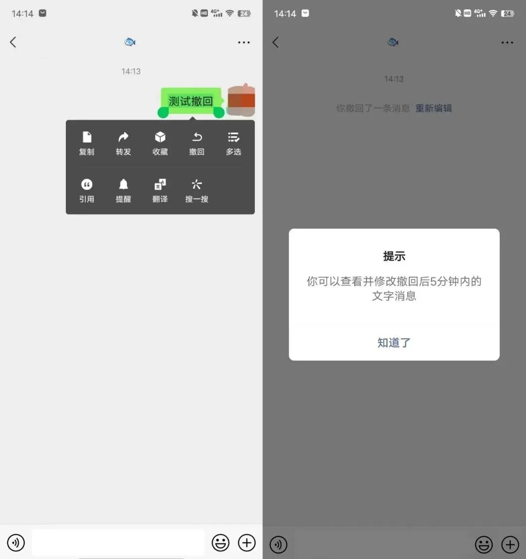 如上图所见,微信显示可以查看并修改撤回后5分钟内的文字消息。但其实并不是能撤回5分钟内的消息。微信向新浪科技回应称此为谣言,同时微信表示,目前用户发出消息后,可撤回的时限仍是2分钟。图里的5分钟以内是指可以使用“重新编辑”功能进行编辑,而不是5分钟内撤回。