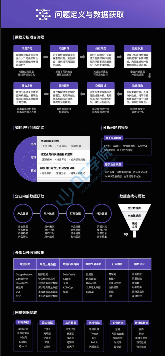 这一张图,可以帮助你快速认识数据分析这个领域,即便你从未接触过相关的内容,也可以很清晰地建立数据分析知识框架。
