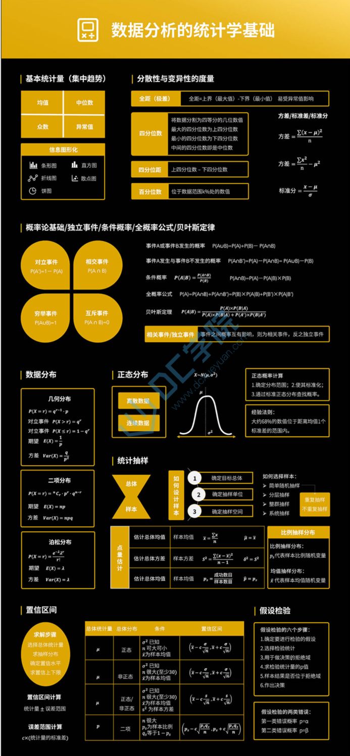 如果说数据分析需要什么数学基础,那统计学应该是设计最多的了,但不需要非常深入,因为大多数数据分析用到的无非是统计量、数据分布等基础知识。