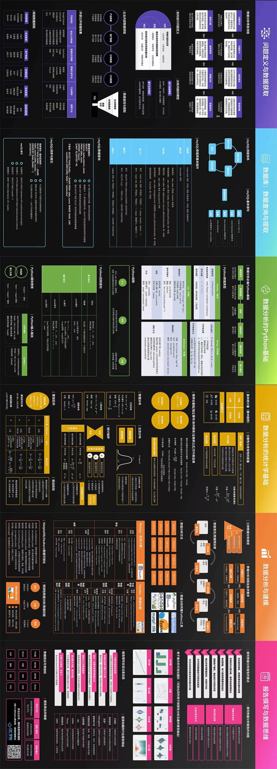 这是数据分析小白必备的数据分析技能图,因为包含了Python数据分析全方位的技能体系,比如数据获取、SQL数据库、Python、统计学、数据分析核心模块、可视化、报告撰写等等都有详细拆解。