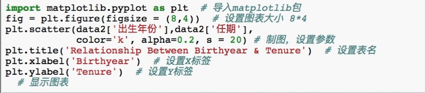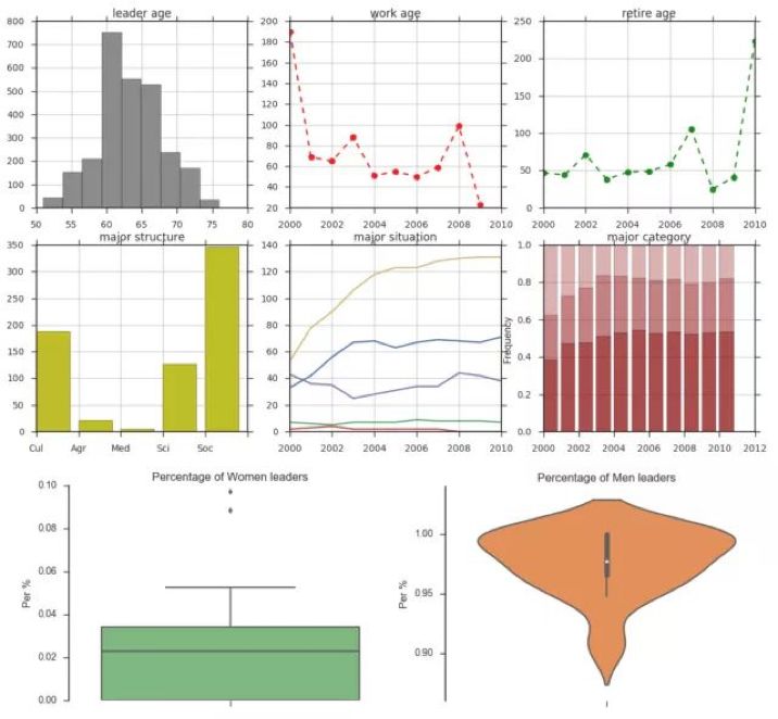 此外,还可获得多对规律关系及各种图表。例如,先对比两个维度,尝试着分析市委书记们的出生年月和任期的关系,直接把计算的结果整理好,调用Matplotlib和Seaborn两个工具包,就可以做出图表。