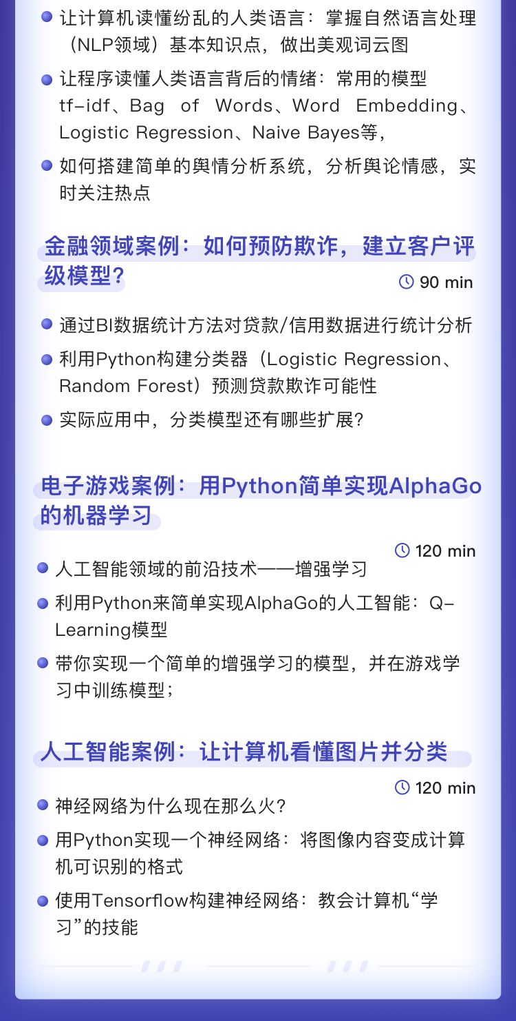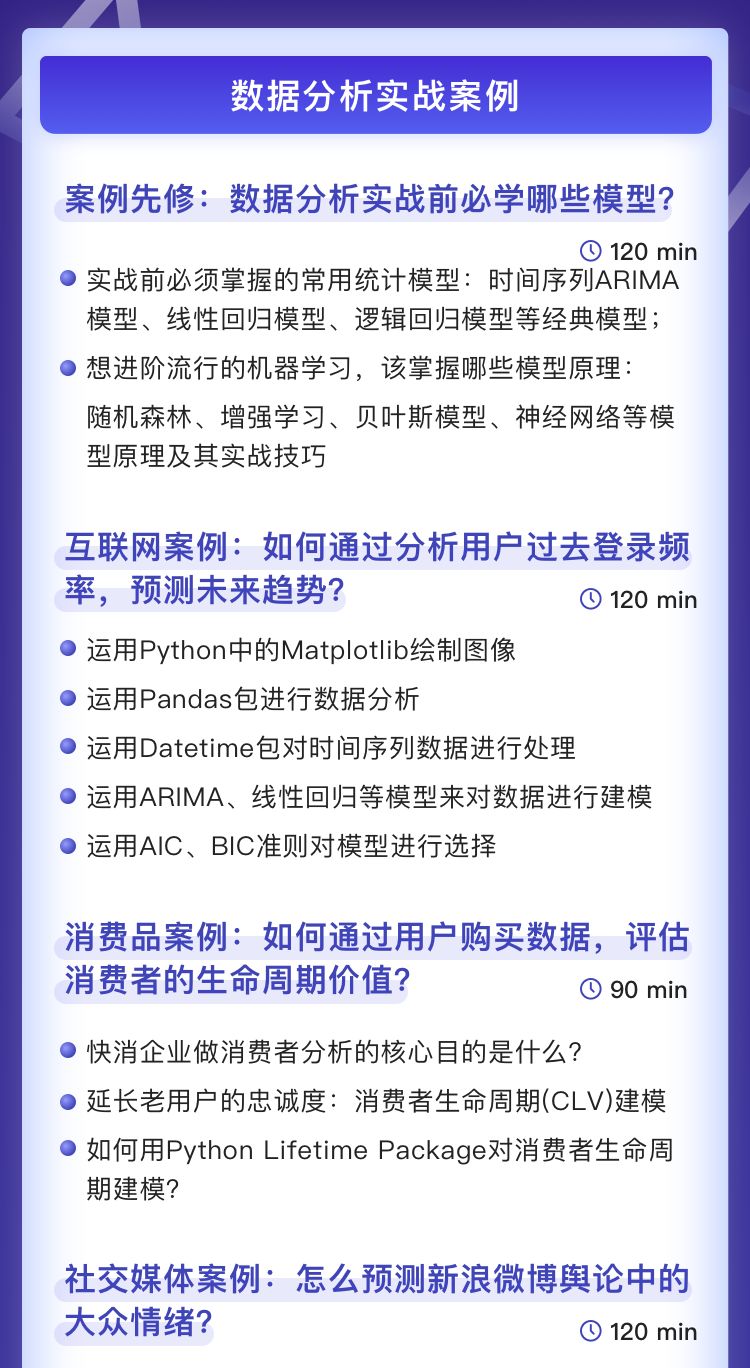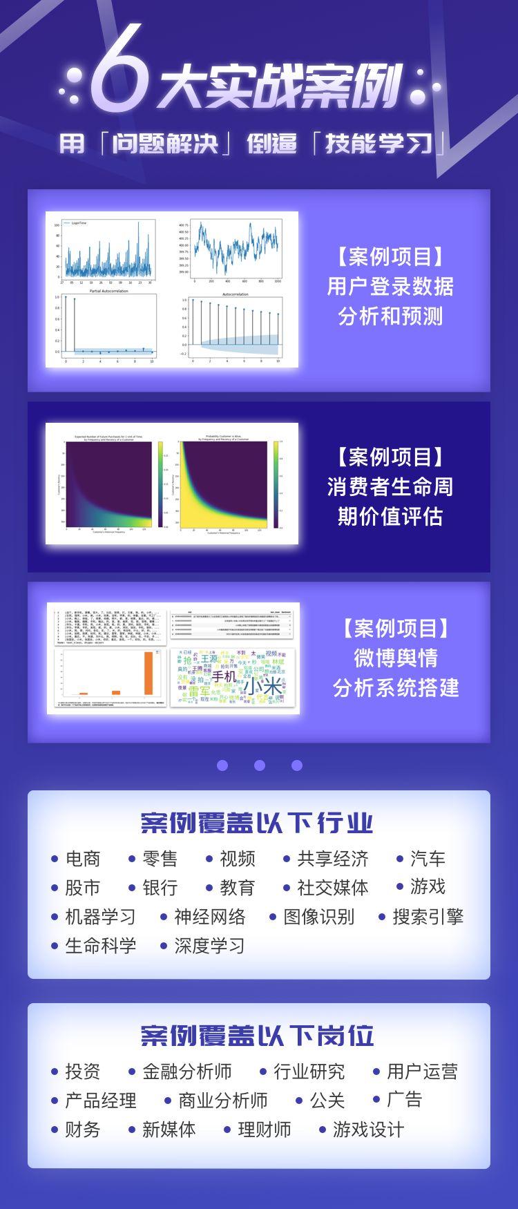 4. 20+小时丰富案例演示,涉及金融、电商、零售、互联网等领域,覆盖商业分析师、金融分析师、行业研究、用户运营、产品经理等岗位的数据分析工作。