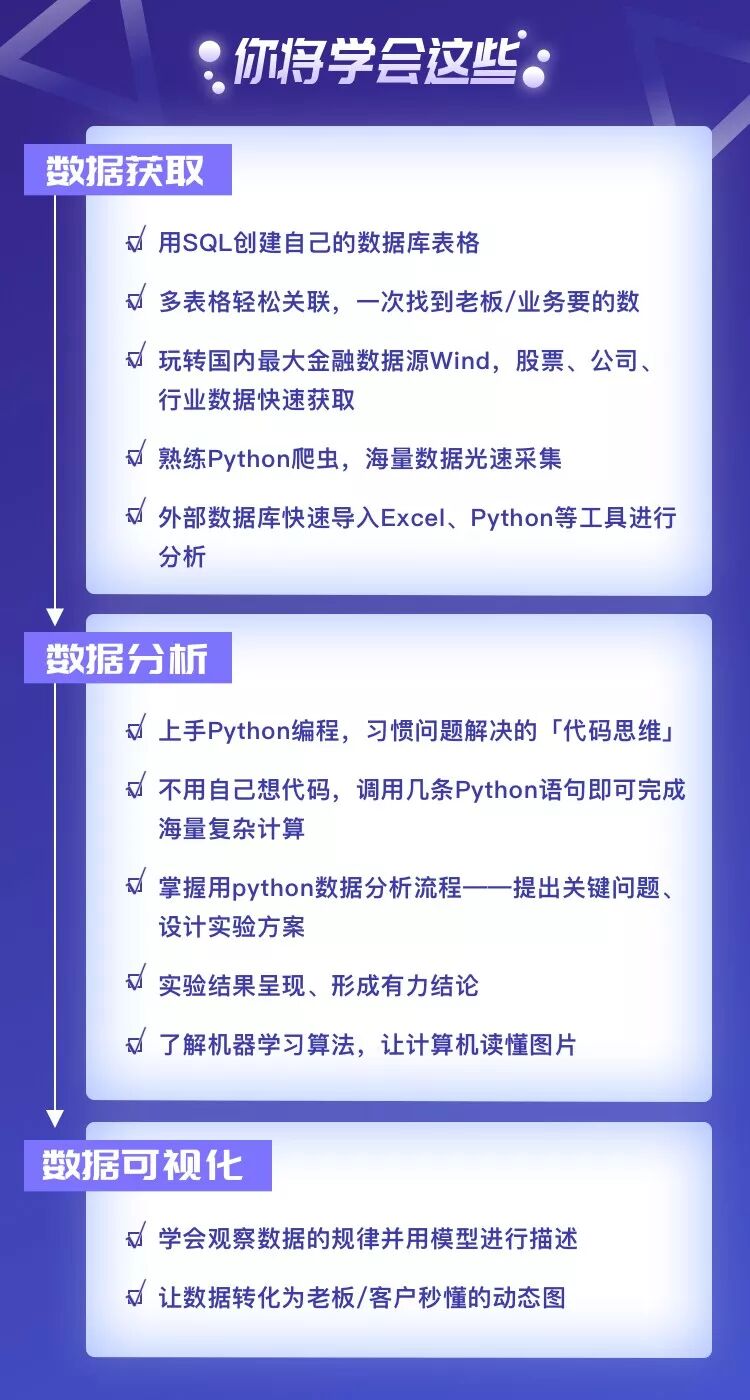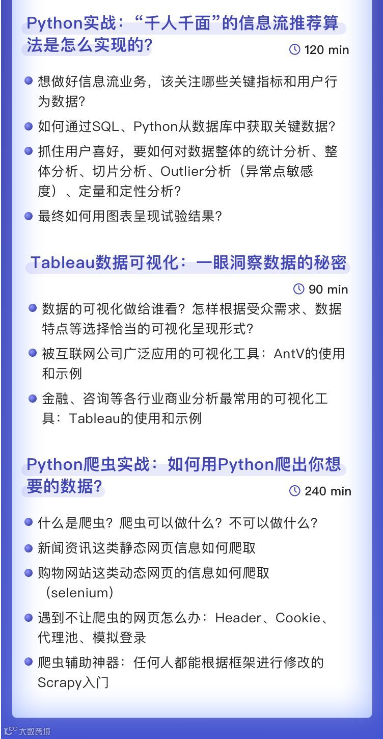 4.实际工作场景中,像腾讯/阿里/麦肯锡的商业分析师,完成一套数据分析的工作,通常是需要Python、SQL、Tableau等多个工具结合完成的,逐一学习这些工具实在太慢了。