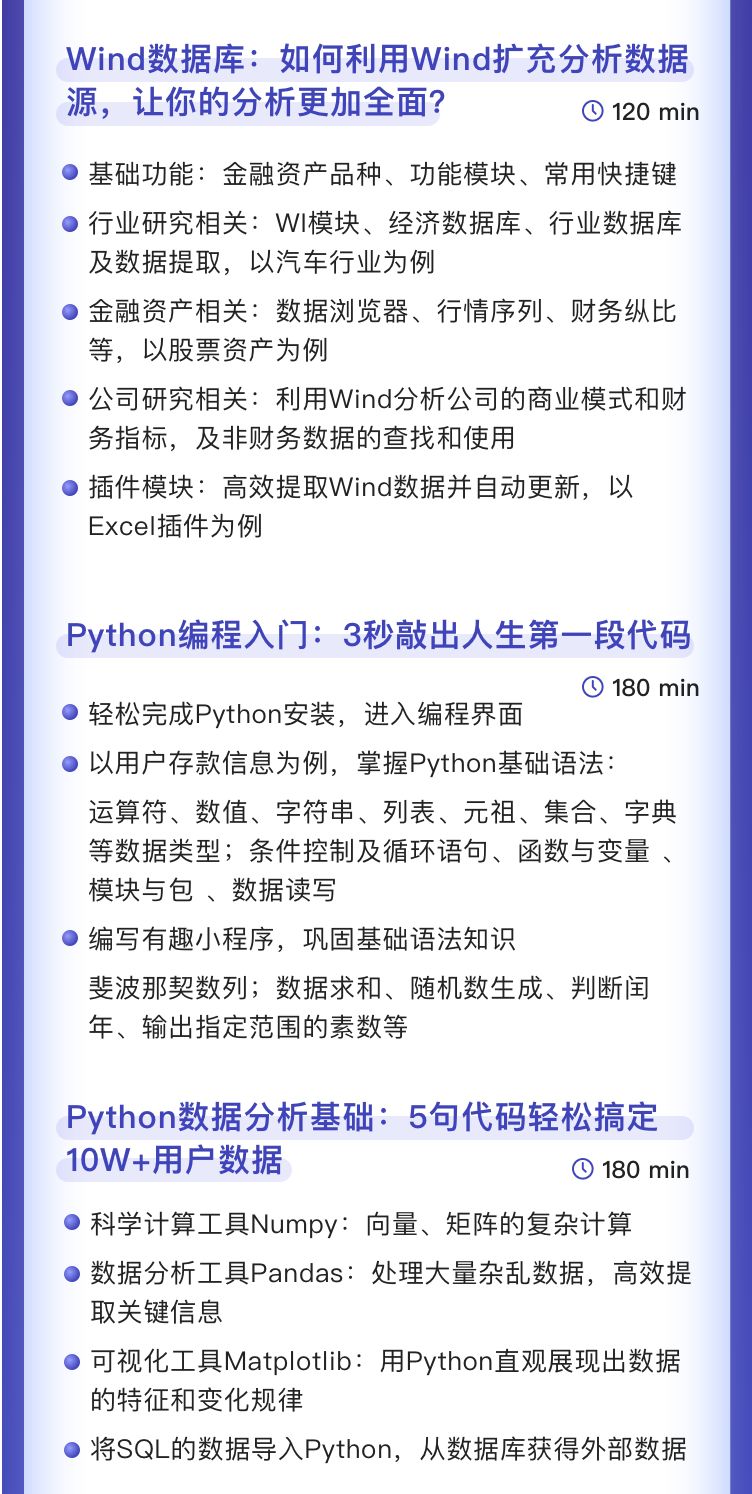 1. 这些课程对于没有工科背景的人太不友好了,课程主要讲的还是程序员的 Python 技术。但对于不走技术岗位的商科学生来说,其实是不需要学到程序员的水平的,那应该学到什么程度?在投行、咨询公司中的应用场景是怎样的?从这些课程中无从得知。