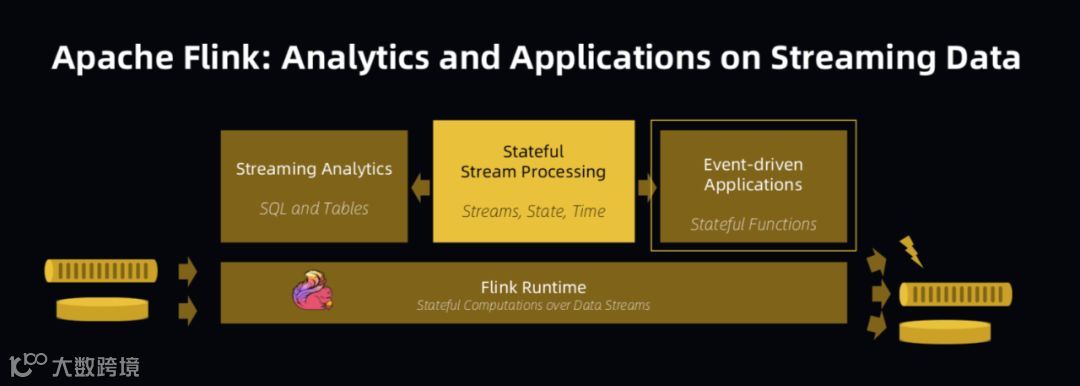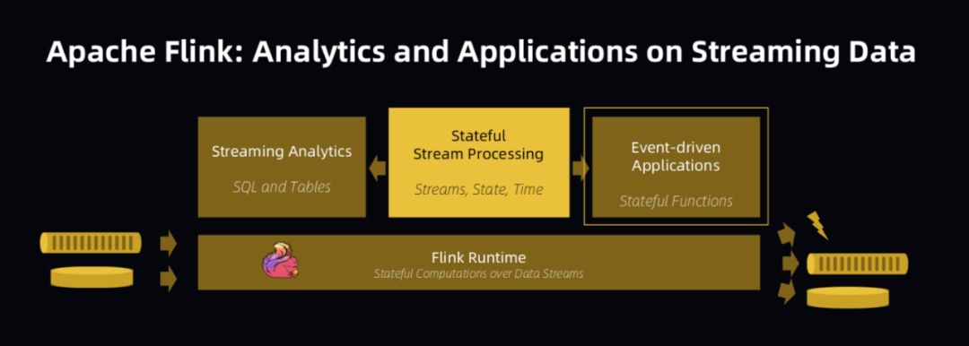 照例,第一个主议题由 Flink 一哥 Stephan Ewen 执棒。作为对 Flink Forward 柏林站的延续,Stephan 继续推广他对 Flink 作为应用服务场景(Applications and Services)通用引擎的展望和规划。简而言之,他认为 Flink 除了能够做到批流一体,Flink 框架对于事件驱动的在线应用也可以有效甚至更好的支持,如下图所示: