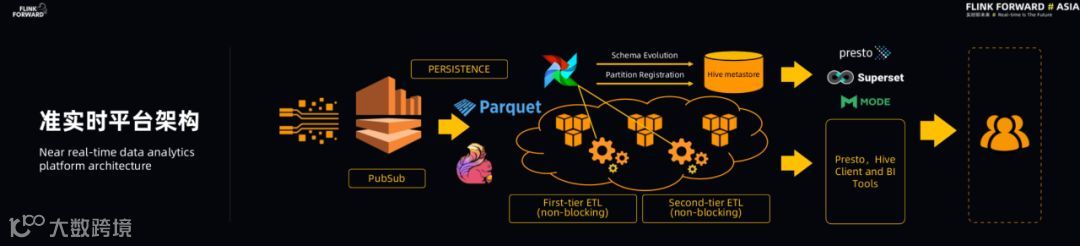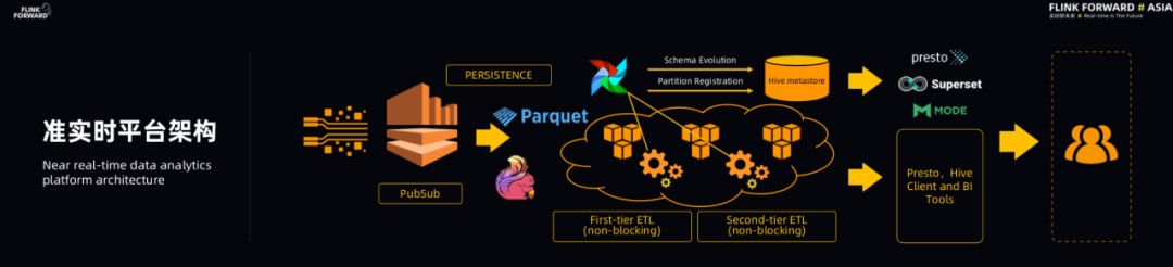 Flink 在整个架构中是用来做流数据注入的,Flink 向 AWS S3 以 Parquet 的格式持久化数据,并以这些原始数据为基础,进行多级 non-blocking 的 ETL 加工(压缩去重),建立实时数仓,用于交互式数据查询。