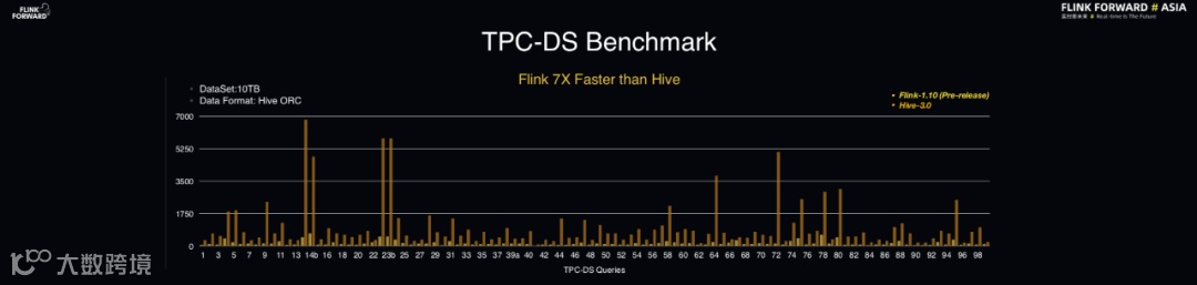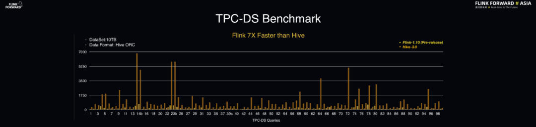 另外这部分印象比较深刻的一点是:跑 TPC-DS benchmark,Flink 1.10 比 Hive-3.0 快 7 倍: