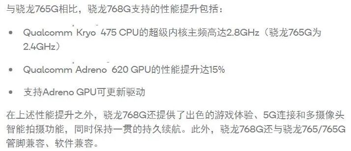 骁龙768G相比765G主频升级为2.8Ghz,GPU性能提升约15%