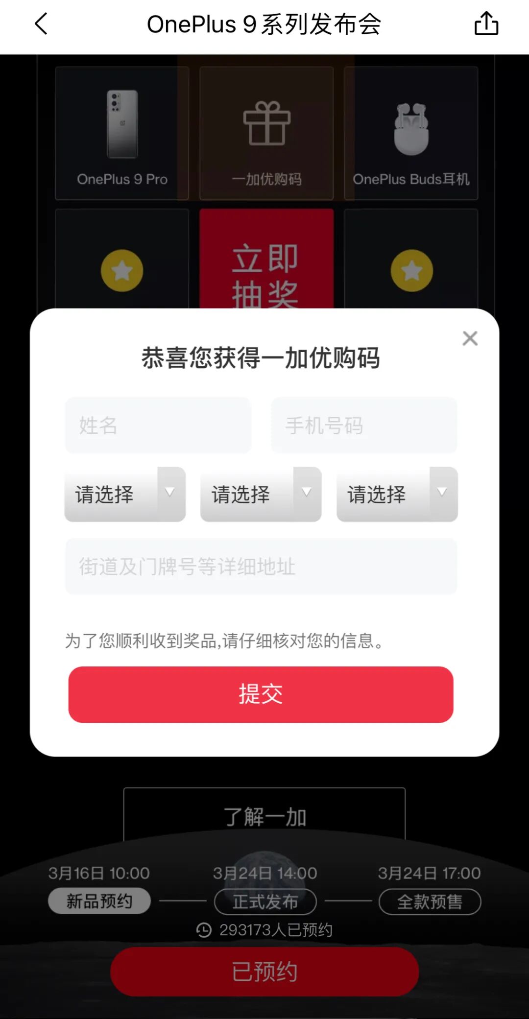 另一边,值得注意的是, 在欢太商城预约一加9系列还可参与抽奖,中奖率似乎非常高,小白和小伙伴随手参与都中了一个优购码,侧面佐证一加这次备货很多?🤔