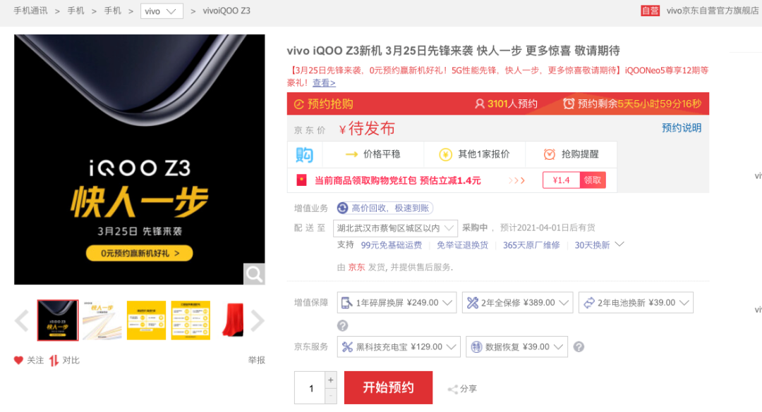 日前,iQOO在刚发布iQOO Neo 5后就在微博预热了一款新机——iQOO Z3,虽然目前官方并未宣布新机的具体发布时间,但今天在京东自营预约界面已经可以提前知晓。
