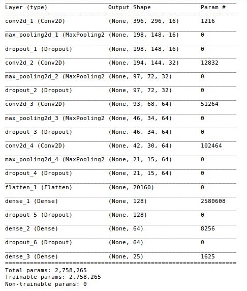 下一步是定义模型结构。输出层将有25个神经元(等于类型的数量),我们将使用sigmoid作为激活函数。