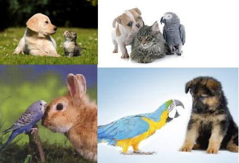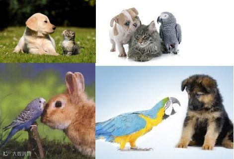 第二幅图(右上角)包括一只狗、一只猫和一只鹦鹉