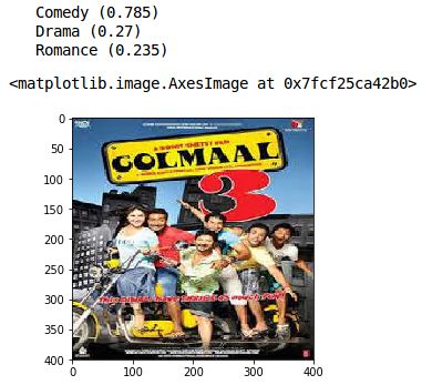 我们的模型给出的类型是戏剧、动作和惊悚。同样,这些都是非常准确的结果。这个模型能在好莱坞电影分类上表现的一样优秀吗?让我们来看看。我们将使用这张Golmal 3的海报。