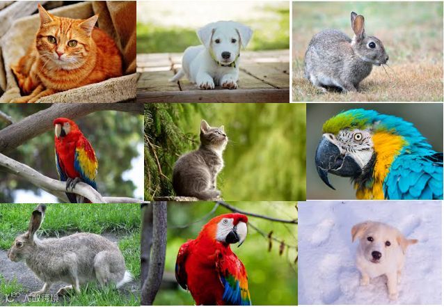 第三幅图(左下角)包含一只兔子和一只鹦鹉,以及