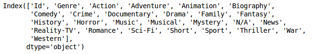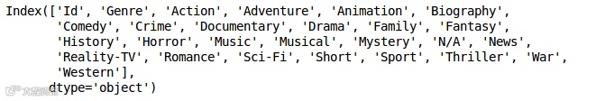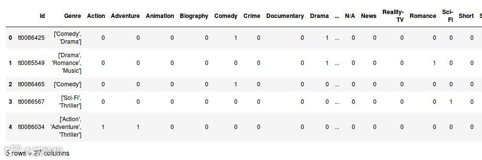 剩下的25列是独热码列。因此,如果一部电影属于动作类型,它的值将为1,否则为0。每个图像可以属于25种不同的类型。