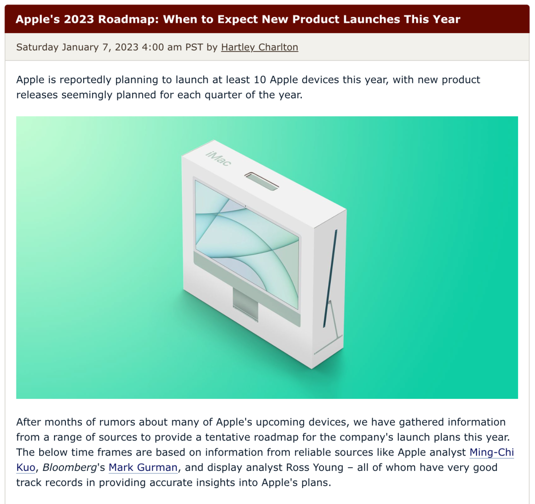 MacRumors基于爆料和分析师消息整理了苹果 2023 年可能更新的产品及大概发布的时间线,上半年更新集中在Mac类产品更新、下半年主要是新iPhone。
