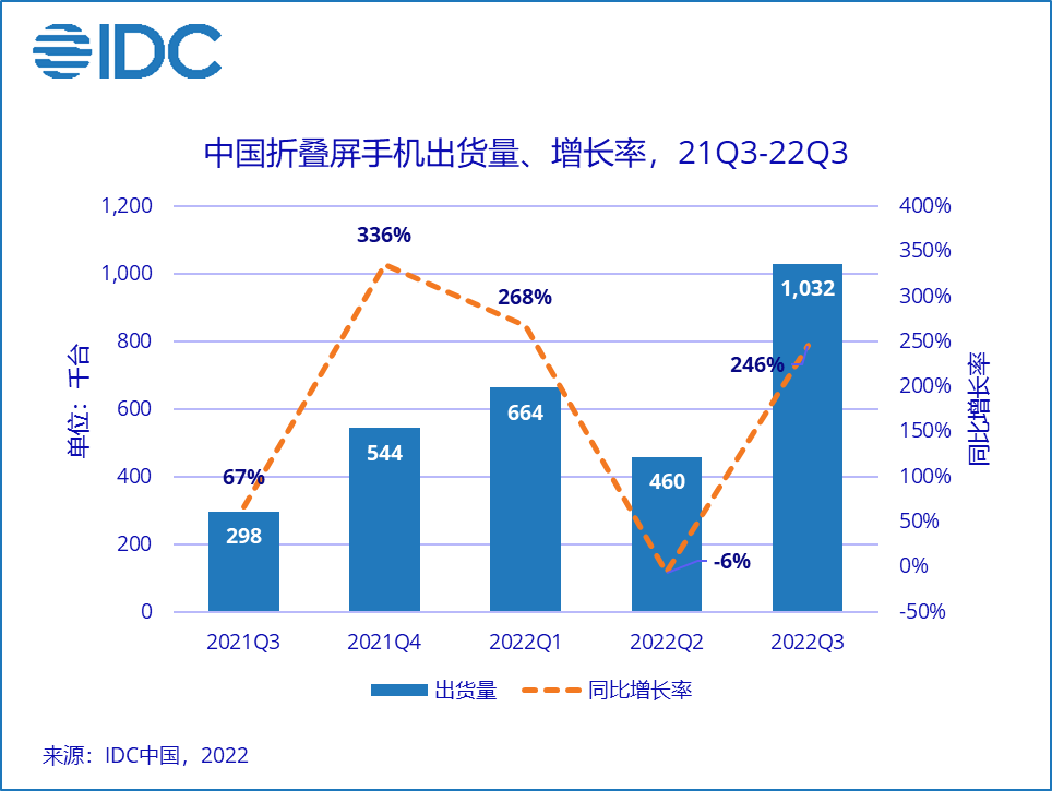 IDC数据显示,2022Q3单季中国折叠屏整体市场出货量超100万部,同比增长246%,创有史以来最大单季出货量。也就是说在过去的这3个月,买折叠屏的用户更多了,而且增长不少。