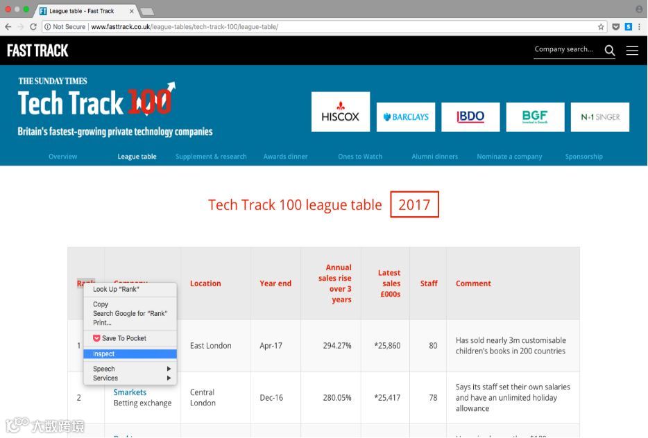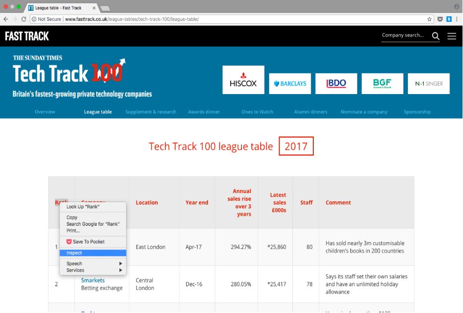 要从Tech Track Top 100 companies收集数据,可以通过右键单击感兴趣的元素来检查页面,然后选择检查。这将打开HTML代码,我们可以在其中看到每个字段包含在其中的元素。