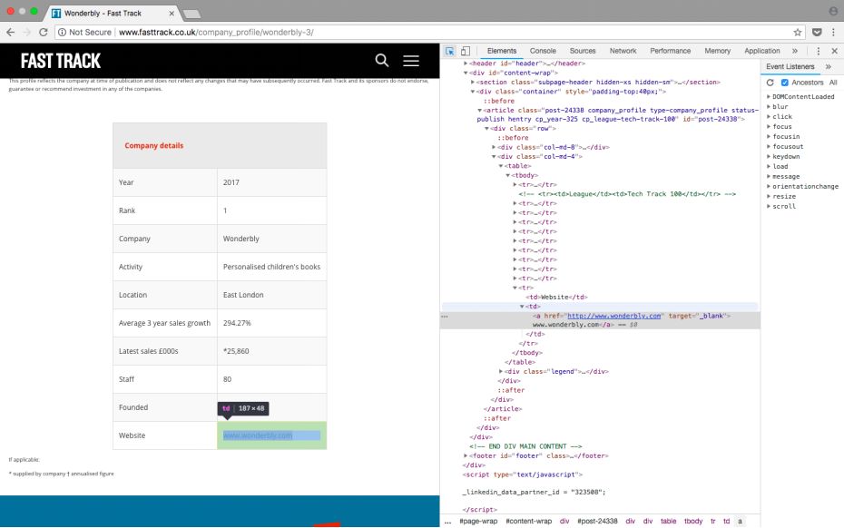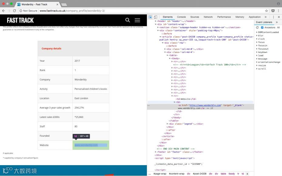 我们要保存的最后一个变量是公司网站。如上所述,第二列包含指向另一个页面的链接,该页面具有每个公司的概述。 每个公司页面都有自己的表格,大部分时间都包含公司网站。