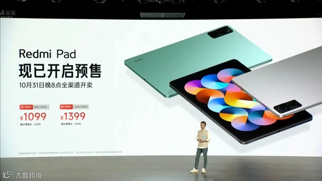 首先是Redmi Pad,4+128GB版售价1099元,6+128GB版售价1399元,将于10月31日晚8点开卖。配置参数和月初海外发布的一样:10.6英寸2000*1200分辨率的LCD屏,90Hz刷新率,SGS低视觉疲劳认证+莱茵硬件低蓝光认证,面部识别,金属一体式设计,深灰色、银色、烟青绿3个配色。