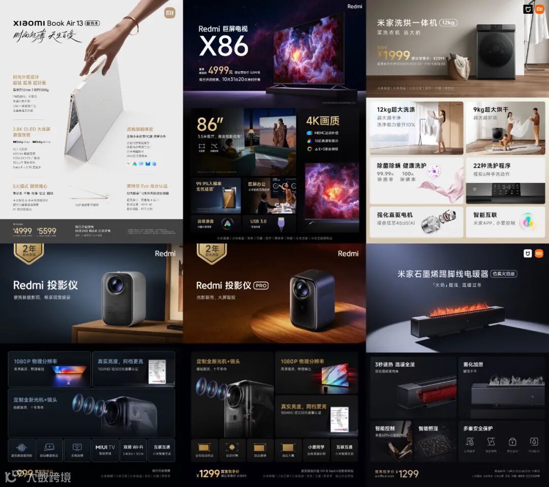 另外还有小米Book Air 13轻薄可翻转笔记本电脑,支持跨屏互联,首发价4999元起;Redmi X86巨屏电视4999元起;Redmi投影仪内置MIUI TV,999元起售;米家洗烘一体机12KG:1999元;米家石墨烯踢脚线电暖气:1299元。