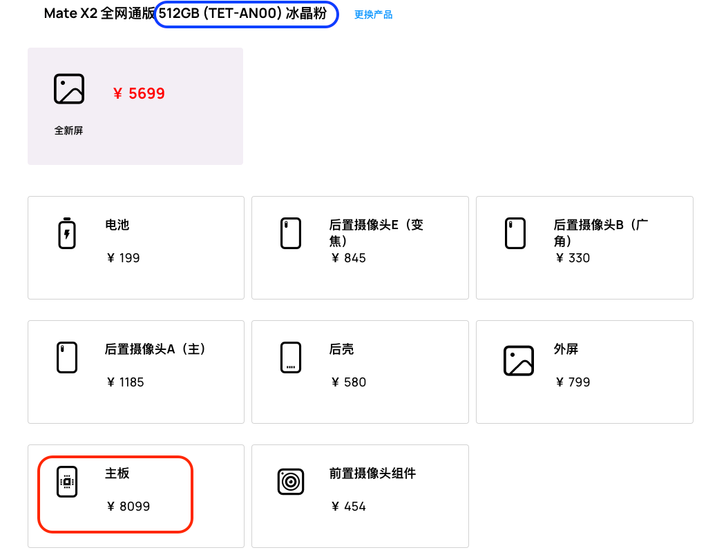 如上图所见,华为Mate X2更换全新屏价格为5699元,外屏799元,后壳580元,电池199元,前置摄像头组件454元,后置主摄1185元,后置广角330元,后置变焦845元,256GB版本更换主板价格为7199元。