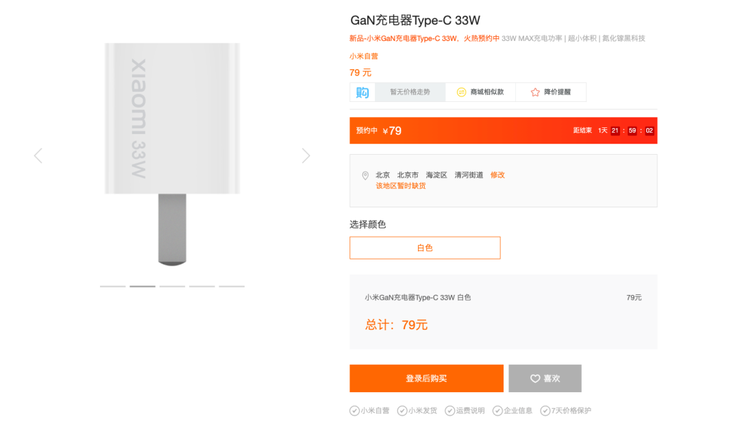 售价部分,小米全新33W氮化镓充电头售价79元,目前已经开启预约,将于2月25日9:55正式开卖。