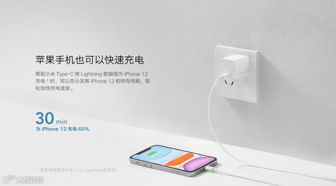 搭配lighting数据线支持给iPhone 12充电30分钟充60%。